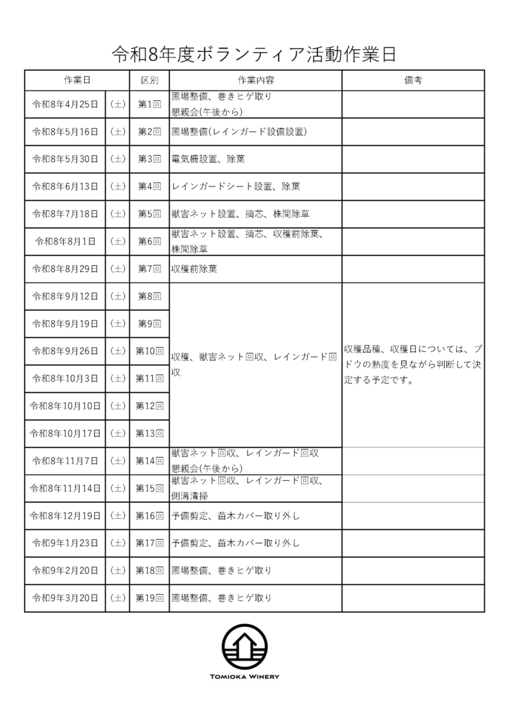 2026(令和8)年度のとみおかワイナリー ボランティア活動の年間スケジュールが決まりましたのでお知らせします。