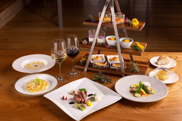 とみおかワイナリーのぶどう畑や海が臨める絶景のロケーションの中、お食事やワインが楽しめます。外のテラス席では、グランピングBBQを楽しむことができます。